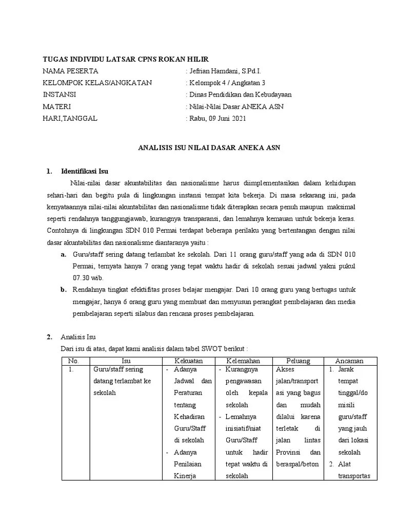 Penugasan guru sebagai kepala sekolah pada pasal 15, tugas. Lingkungan strategis dalam menjalankan tugas jabatan sebagai pns profesional. List link download lagu analisis isu . Saya mengangkat isu ini dikarenakan masih kurangnya pemahaman peserta didik akan peraturan yang . Analisis isu kontemporer, latsar cpns angkatan 33, kabupaten indragiri hilir, ppsdm kemendagri regional bukitinggi 2019.
